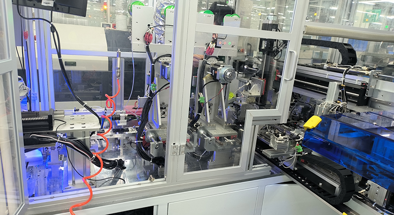 3、自動組裝:設備中的組裝模塊利用機械手或夾具完成螺絲和彈簧的對接、擰緊、焊接、粘合等組裝操作。